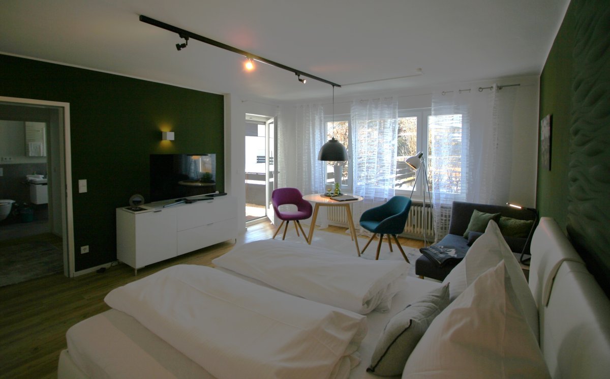 The modern combined living and sleeping room is furnished with modern style high quality. A very big flatscreen TV, cd/dvd player, stereo create a comfortable ambience. From the living room you have access to the southwest facing terrace with a beautiful view to the mountains. Patio furniture and sun shade are available as well. The comfortable bed provides oversized duvets and indirect coloured lighting. In the corridor you will find a wardrobe with a safe for your valuable things. The kitchen is equipped with a glass ceramic cook surface, microwave, oven, dishwasher, coffee machine, espresso machine, toaster, electric kettle,crockery and glasses. A shower on grade, sink and a toilet, as well as towels and bath towels, body lotion, shower gel and soap are there for your convenience. We are looking forward to having you here as our guests and are convinced that you will feel perfect in this apartement. Yours sincerely Alpenflair Ferienwohnungen Susanne Achmedsade